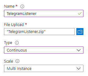 WebJob, který budeme nastavovat, bude typu continuous, což znamená, že nahraný skript poběží nepřetržitě. Skript bude napsaný v Pythonu a vyzkoušíme si pomocí knihovny Telethon odposlouchávat zprávy z Telegramu. Toto řešení má několik možných využití: zprávy můžeme například přeposílat do jiné služby, nebo je použít jako příkazy. Obě možnosti jsou zajímavé, ale použití závisí na konkrétním scénáři. 🙂 WebJoby mohou běžet pouze na platformě Windows (Linux zatím není podporován) a vyžadují minimálně App Service plán B1.