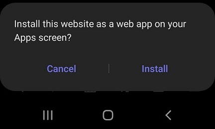 Výsledkem je webová aplikace, která funguje i v offline režimu (alespoň do té míry, do které má potřebné soubory v cache úložišti). Můžeme jí také nainstalovat (na desktopu do chrome://apps/ nebo edge://apps/, na mobilu jako aplikaci). Na mém Samsung Galaxy A40 v dark módu se Samsung Internet prohlížečem, který používá Chromium engine vypadá postup následovně.